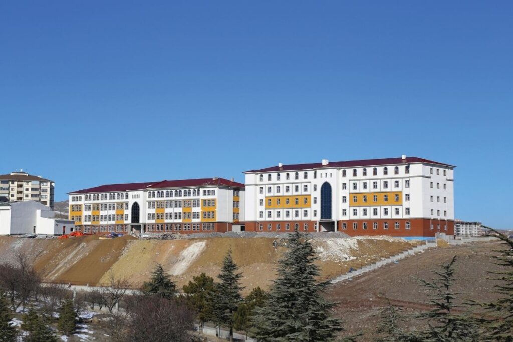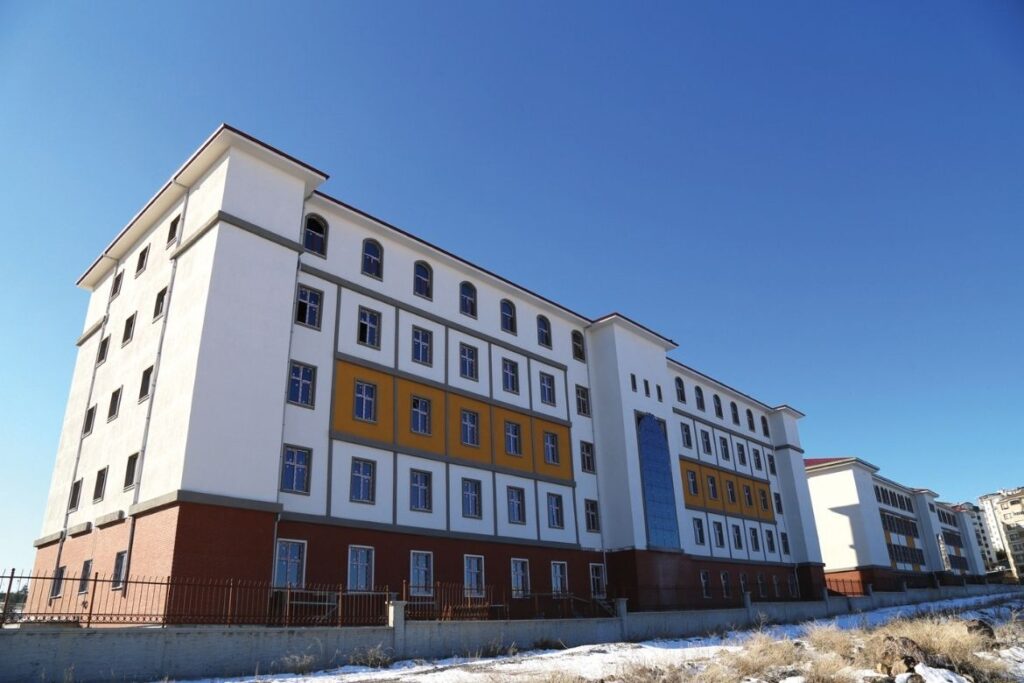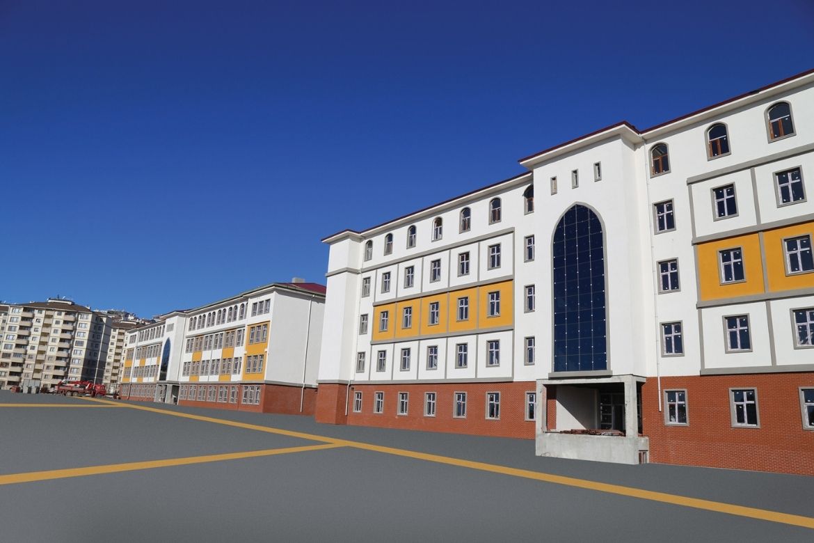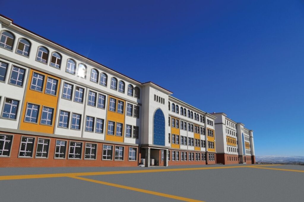 This project comprises a total construction area of 15,200 m2 and includes a 32-classroom high school, a 200-student dormitory, a sports hall, and a mosque. The buildings feature multipurpose halls, physical education spaces, laboratories, and a library.